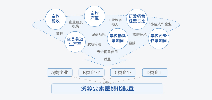 通过多维数据采集和动态数据更新,同时将政府跨层级、 跨部门、跨系统数据信息交换共享和协同,建立产业核心数据库;在此基础上,以地块为单位开展企业综合评价,帮助政府部门全面把握区域产业经济发展水平;同时对各家企业进行核心能力测评和打分定级 ,以正向激励和反向倒逼的方式推动企业转型发展。