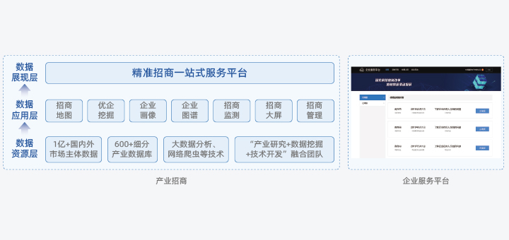全面实时了解企业发展现状和问 题需求,提供一站式企业服务体系支撑;优化招商,助力产业结构优化