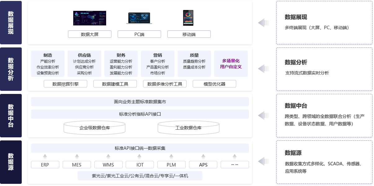 企业云图运用大数据、云计算、物联网等技术,采集设备数据、信息系统数据、外部数据等,融合精益管理、PDCA、价值流等理念,对企业进行全息实时画像,实现数据融合,打通企业核心价值链。通过预测模型和机器学习,智能演绎企业未来画像,为企业决策提供数据化支撑,帮助企业跨越增长瓶颈,提升核心竞争力,实现可持续改善。
