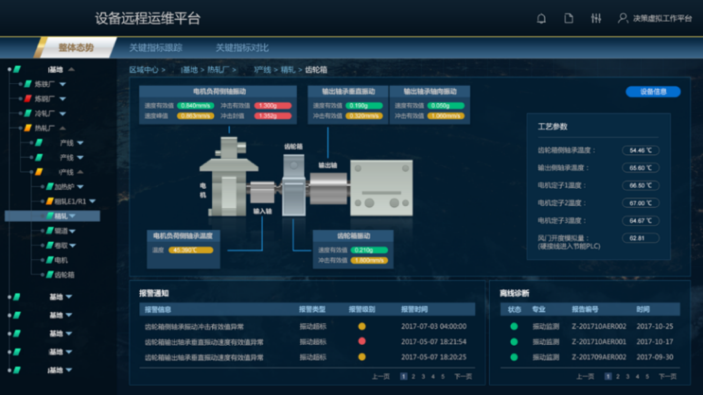 某钢铁集团生产智能设备诊断云平台,集成并融合L1/L2、EQMS、BPC、在线质量检测系统、离散受控检测设备等异构数据源数据,建立诊断服务中心,完成生产检测的状态监控、故障诊断、运维优化、预测分析等功能,帮助该集团实现数字资产的价值沉淀,完成集团统一管理、远程监控、分级诊断、智能运维的综合管理指标要求。