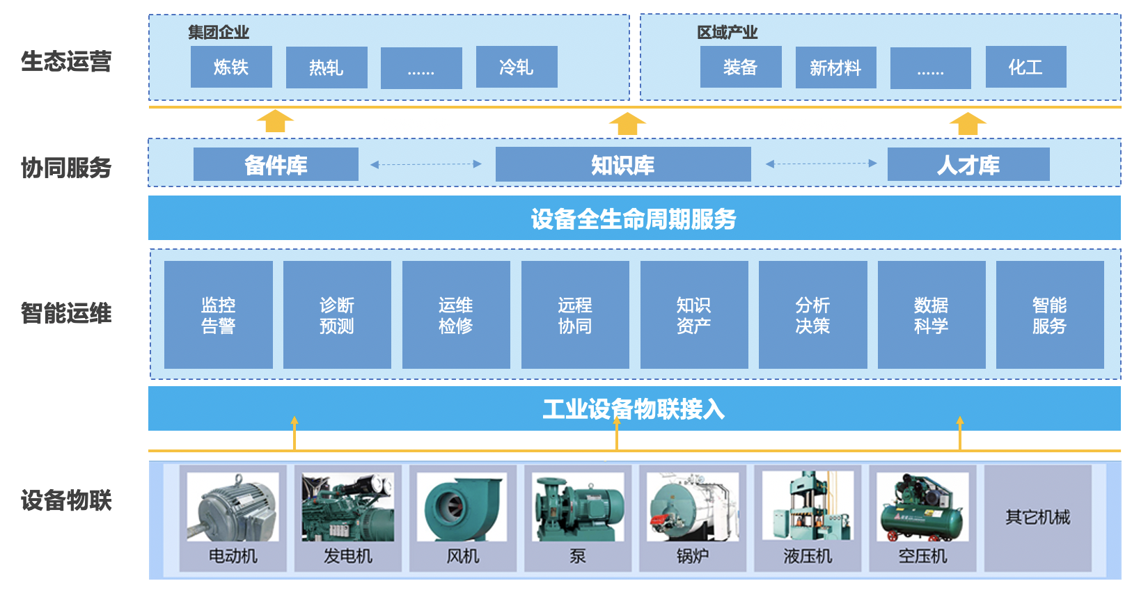 通过融合多设备、多状态、多专业、多领域的数据,打造设备管理、维保管理、自动化巡检一体化服务平台;利用大数据分析,将产线专家的经验固化成故障预测模型,结合不断积累的状态数据、工艺数据训练模型,让故障预测更加准确,减少产线非计划性停机;同时面向区域或集团构建企业备品库、知识库、人才库等网络化协同新模式,为钢铁冶金设备全生命周期管理提供保障。