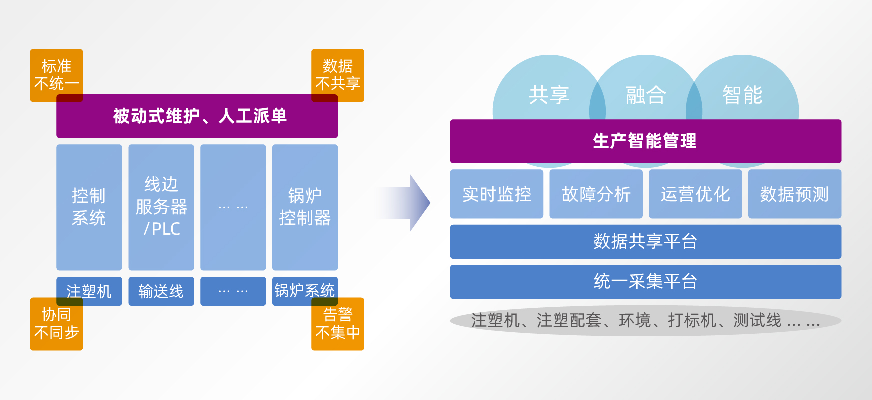 遵循智能制造体系建设过程,以紫光工业互联网平台为依托,实现信息技术与运营技术的融合,面向工厂内多样化的车间、设备,搭建统一采集平台,形成数据融合资源池,建设实时监控、故障诊断、运营优化与预测分析应用,实现共享、融合、智能化的设备综合服务与管理。技术层面,应用云计算、大数据、物联网等先进技术,充分利用云、大、物、智、移的技术优势和特点,构建具备广泛接入能力、多维数据存储、智能数据分析、动态数据可视等特色的技术平台。
